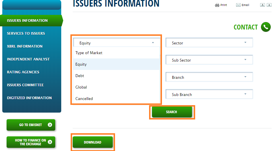 - In the form select Market Type (Equity, Debt, Global) or if you prefer, you can obtain a list of a specific group of issuers in every Market selecting by type of issuer, Sector, Sub Sector, Branch, and Sub Branch.
